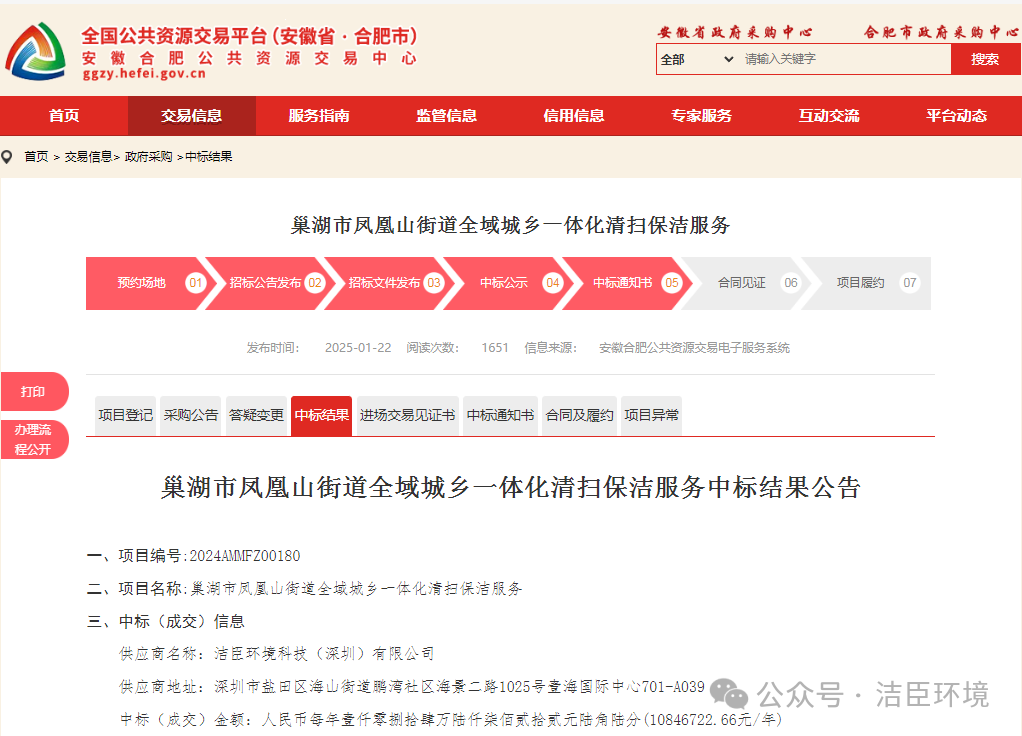 新年伊始,开门红运。1月22日,安徽合肥公共资源交易中心发布公告,威九国际环境科技(深圳)有限公司中标巢湖市凤凰山街道全域城乡一体化清扫保洁服务项目,中标金额10846722.66元/年。正式掀开了2025年公司业绩节节高升的序幕。