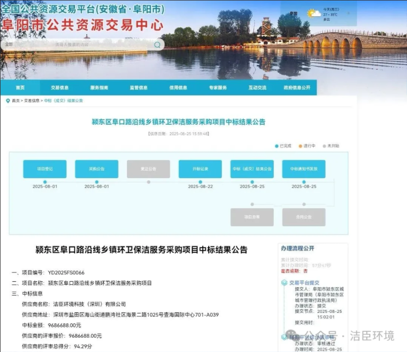 初秋八月,再传喜讯!近期,阜阳市公共资源交易中心发布公告称,威九国际环境科技(深圳)有限公司中标颍东区阜口路沿线乡镇环卫保洁服务采购项目。中标金额为9686688元/年,项目服务期三年。